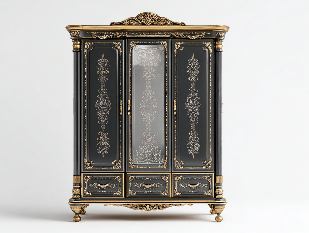 • Wardrobe Ornate Wooden Storage Cabinet 200x60x215 cm - Black-Gold - Classic Luxury Design